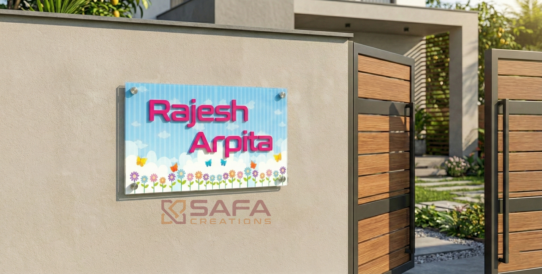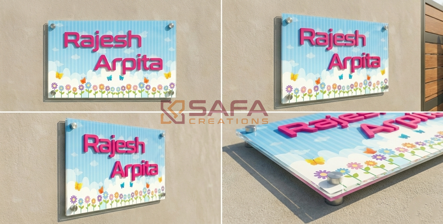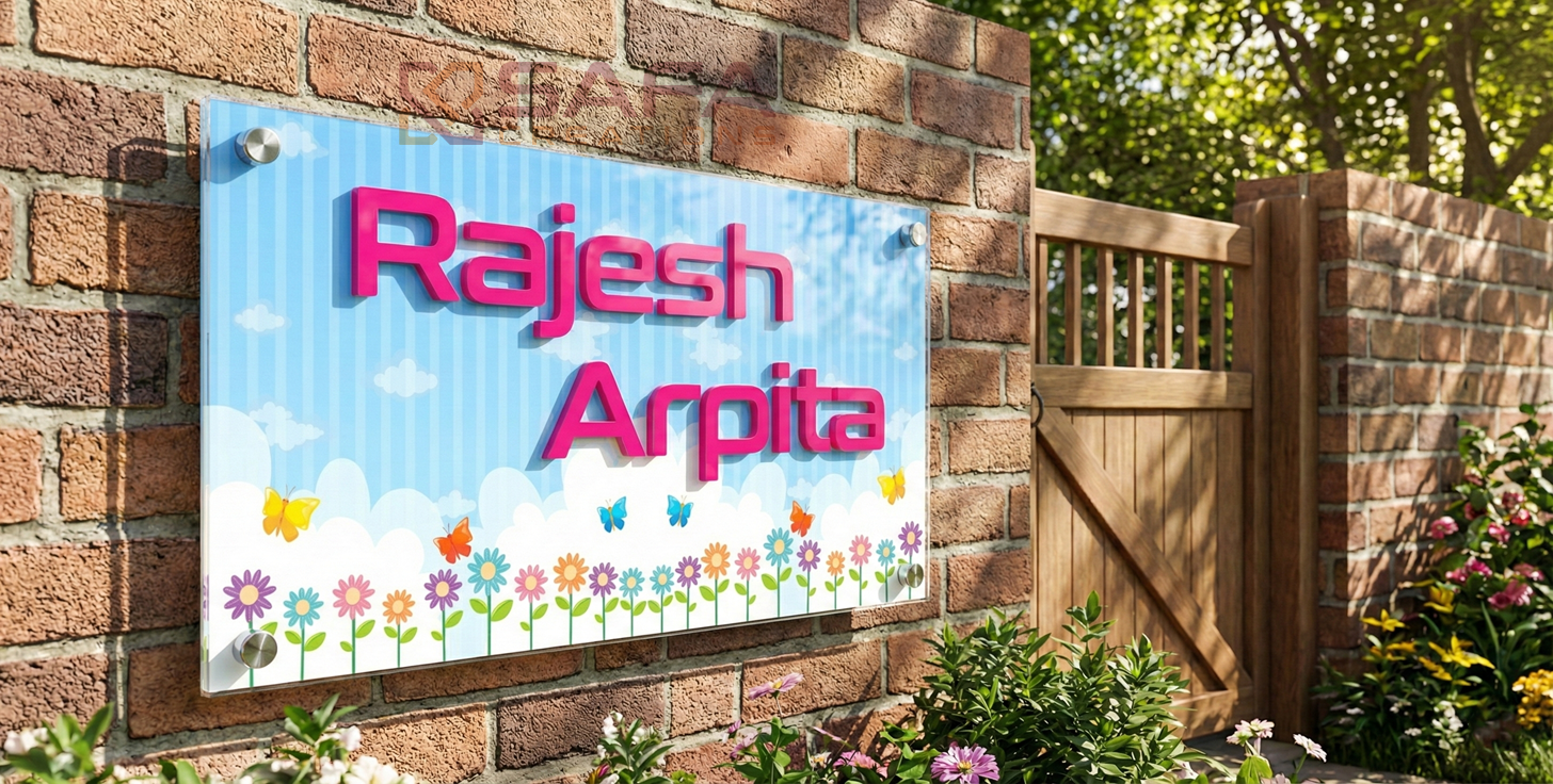 Elevate your home's curb appeal with this charming House Name Plate! Crafted from premium acrylic with vibrant printed designs on the background, it features crisp 3mm letters securely pasted for a modern, dimensional look. Perfect for adding personality to your entrance, this durable nameplate combines style and functionality. Whether you're welcoming guests or simply expressing your home's character, this eye-catching piece makes a delightful first impression. A playful touch that transforms your doorway into something uniquely yours!